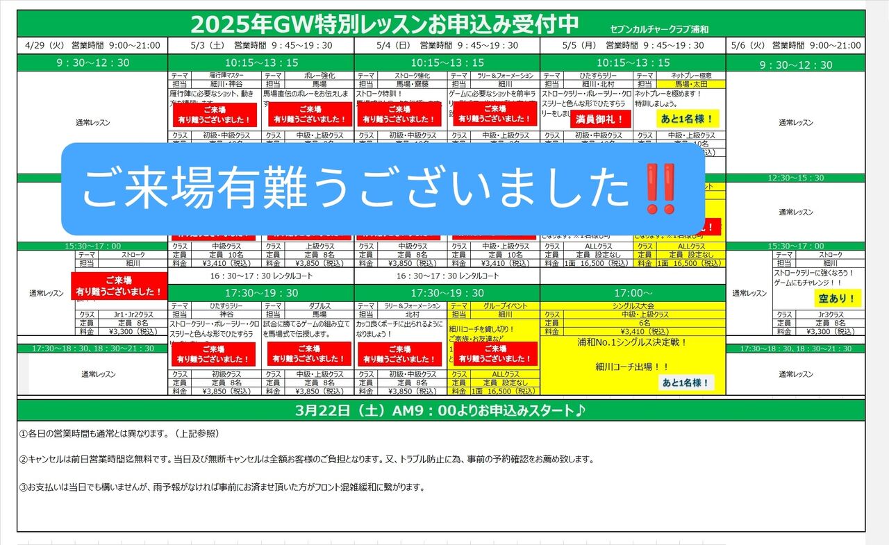 2025年05月05日 GW特別レッスンご来場有難うございました‼️北村コーチvs細川🎾🔥 こんばんは!細川です。GW特別レッスン🔥ご来場有難うございました‼️明日からは5月期の通常レッスンがSTARTします✨明日の5/6(火祝)は通常レッスンだけでなく、15:30〜17:00でJr3クラスの祝日イベントを開催します。まだ空きがございますので、お申し込みお待ちしています😊さて、本日の締めはシングルス大会🏆️細川も5試合やりました!もう太ももが…😅悲鳴をあげてます😱ラストの北村コーチと細川のエキシビションもありがとうございました❗️それではまた。 カテゴリなしの他の記事 < 前の記事次の記事 >