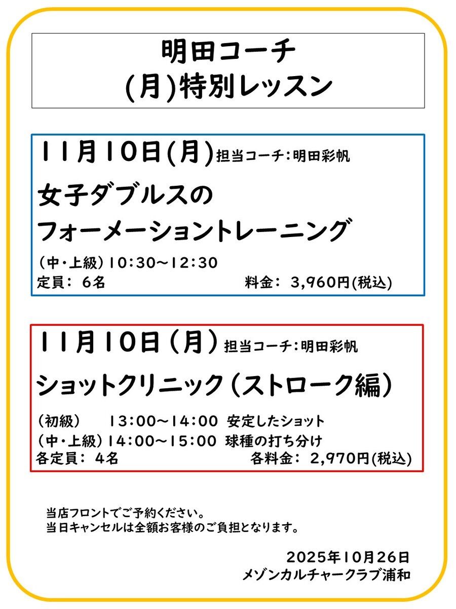 2025年11月02日 スタッフミーティング🎾〜祝日イベント🔥〜月曜日特別レッスン✨ こんばんは!細川です。今日はレッスン終了後にスタッフミーティングを行いました❗新スタッフも交えて、より良いテニススクールを目指していきます‼️さて、明日は祝日イベント🎾午前中は馬場スペシャル✨午後はジュニアオレンジボール大会✴️そして、久喜校で行われるEnjoyカップとイベントが目白押しです🔥皆様のご来場お待ちしています!追記こちらも恒例の【月曜日特別レッスン】🎾こちらもご予約お待ちしています!!それではまた。 カテゴリなしの他の記事 < 前の記事次の記事 >