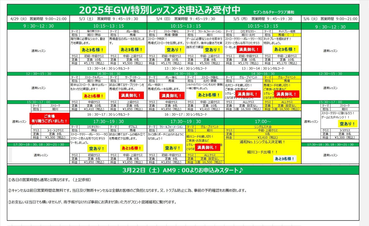 5/1(木)21:30現在のGW特別レッスンお申し込み状況です🎾